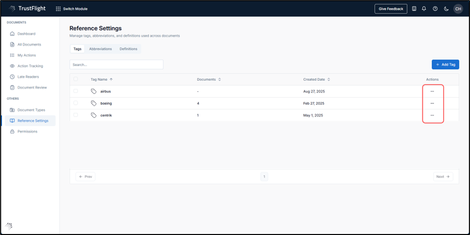 To edit or delete a created Tag, click on the three dots within the Actions column, for the specific Tag you wish to edit or delete.