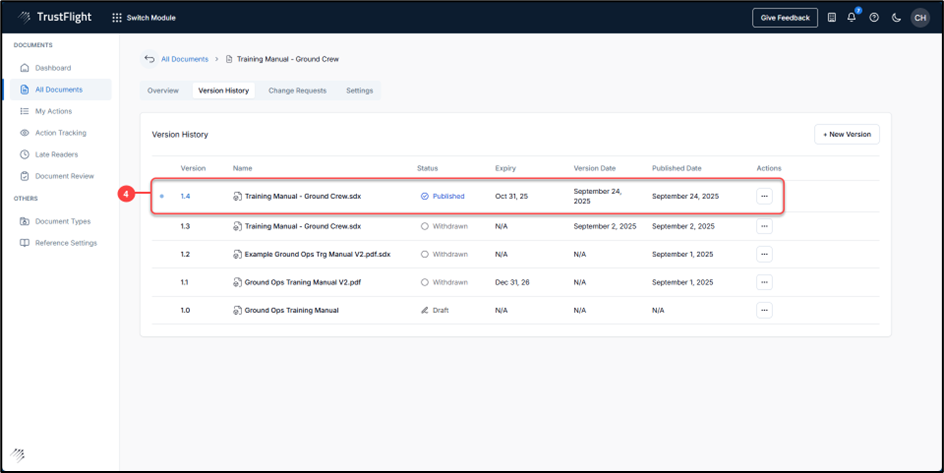 The screen highlights the version you are currently viewing, older / previous versions (withdrawn) can be selected from this page if required.