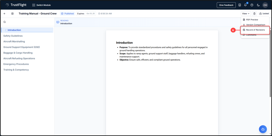 A pop up window displays the Record of Revisions area, displaying the different document Version Number, Version Date, and the Status.