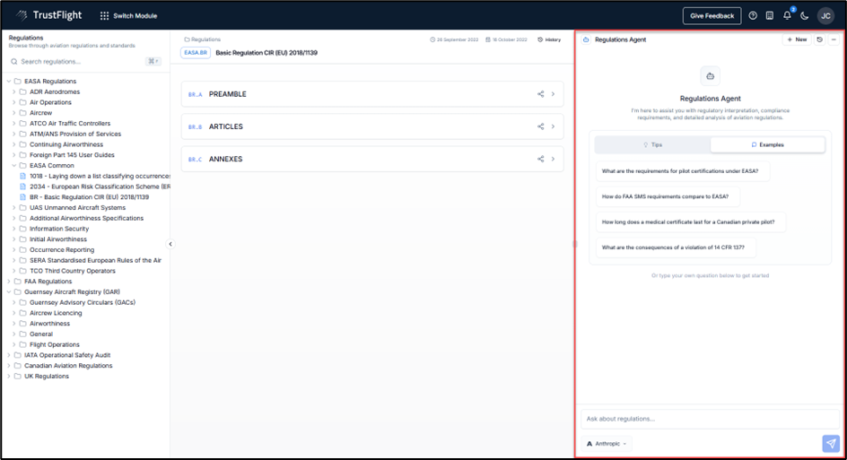 The regulations displayed within your system should align with the specific regulations in your contractual agreement. The responsibility for loading these regulations is with the TrustFlight team, who manage this process. Subsequently, the relevant regulations should be available to you automatically, without any specific action required.