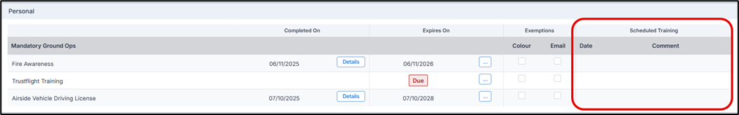 When enabled, the scheduling feature adds a Scheduled Training section to each user’s training record. This section consists of two columns: