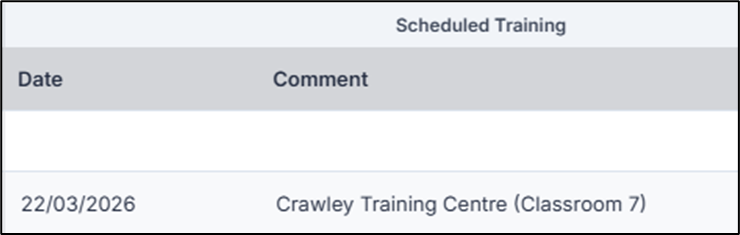 The scheduling feature in the Training module allows you to plan and track when the next training session for a qualification will take place. It also enables you to add comments about the scheduled training.