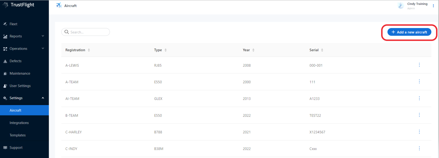 3. Here you can see the list of existing aircraft for your organisation. Click on + Add a New Aircraft in the top right to begin the process.