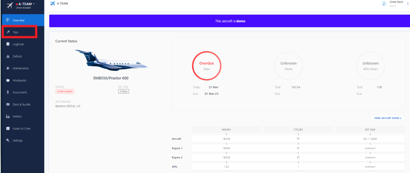 1. Beginning from the aircraft dashboard, click on Trips on the left hand navigation bar.